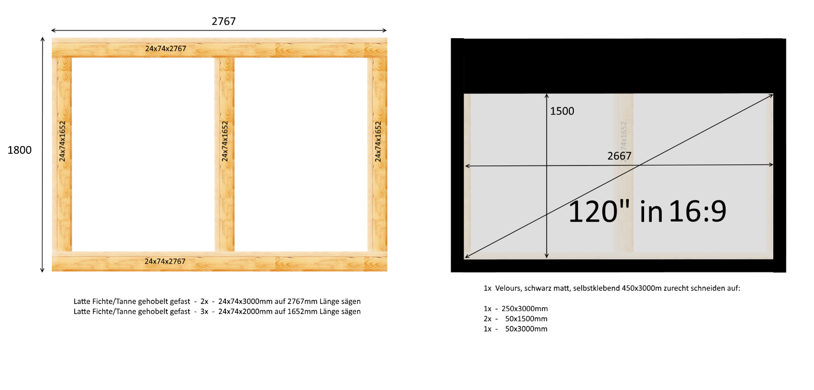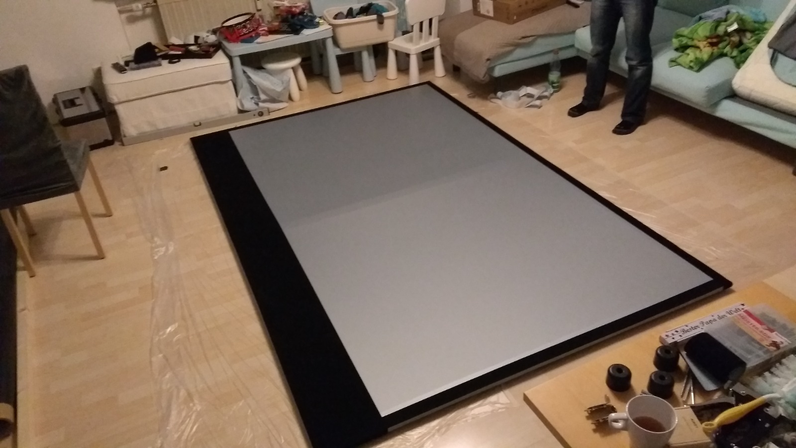 Dann zur Frau gezogen, Papa geworden und 2018 einen Beamer gekauft (auf den gehe ich gleich nochmal extra ein) Das Geld von der Chefin freigegeben, hatte ich mir gesagt: "mach schnell, nicht dass man in der Familie auf eine andere Idee kommt" Planung: selbst faltbare 120" Leinwand mit der beste Folie die man bekommt. Der mittlere Steg, stellte sich später aus Fehler heraus (gleich mehr dazu) Damals im HiFi-Forum "kurz" geschaut und direkt bestell (musste schauen ob ich die Bezeichnung noch finde) Jamos sind damals mit umgezogen + Canton Sub ebenfalls in weiß Alumembran sagte mir damals mehr zu als die Pappe von XTZ. Filz aufgeklebt für eine Maskierung und bessere Kontrast: Test und Verschraubung der Leinwand am Kippmechanismus. GAME - ( Ryzen 7 / RX 9070 / 32GB / B650 ) HTPC - ( Ryzen 5 / RTX 2080 Super / 16GB / B450 ) HIFI - DT 990 Pro, Nubert nuPro-200, Teufel Theater 500, Denon X2500H | |