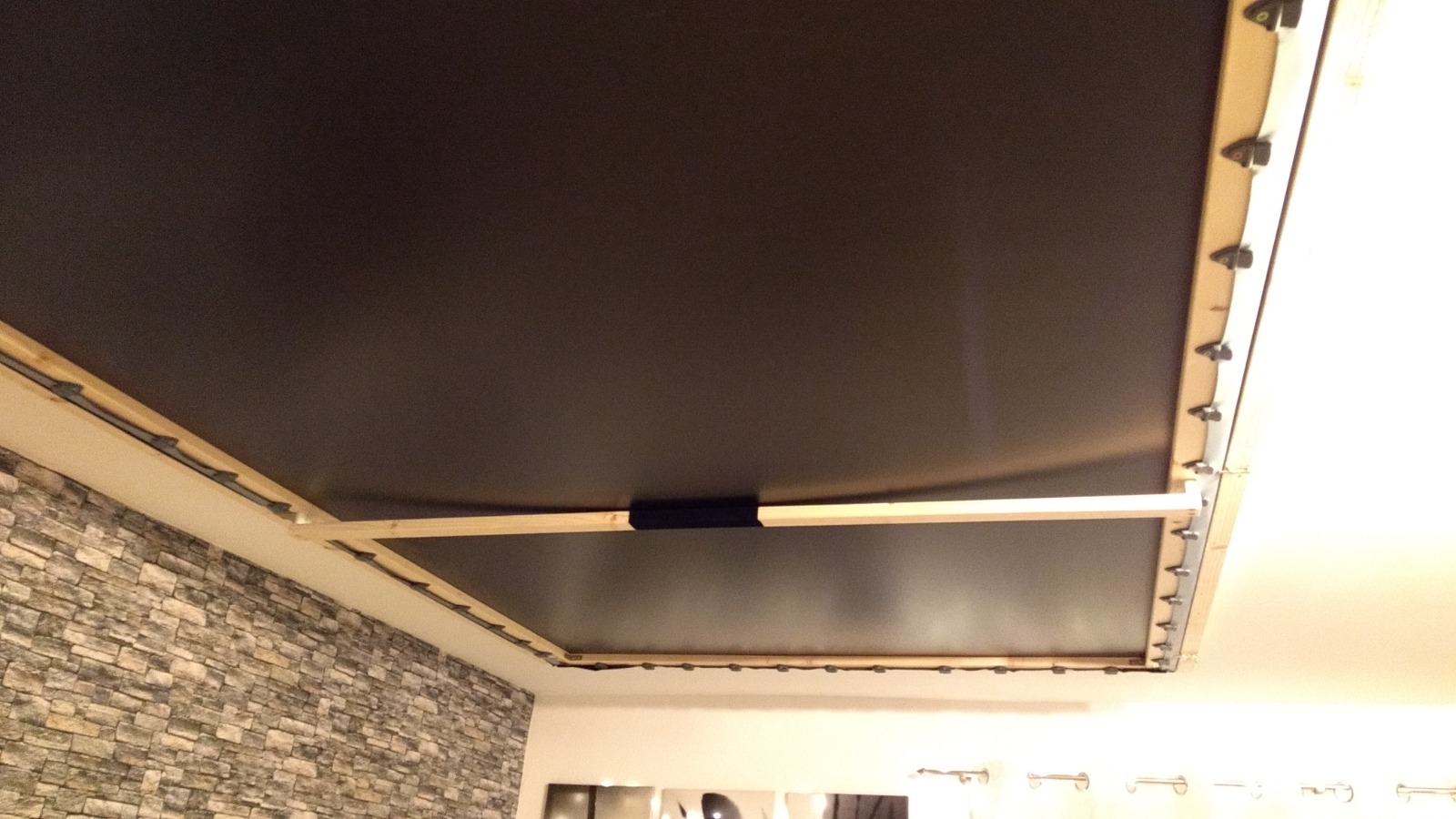 Folie mit diesen Clips "aufgespannt" - gibt ja auch die Variante das mit Ösen und Gummis zu machen. Einfach mal aufgestellt und geschaut wie es tut Hier sieht man den Steg! Wenn der bündig zum Rahmen ist, liegt die Folie auf sobald man die Leinwand an die Decke gekippt wird. Was nach und nach für einen Abdruck sorgt ! Denkfehler meinerseits. GAME - ( Ryzen 7 / RX 9070 / 32GB / B650 )