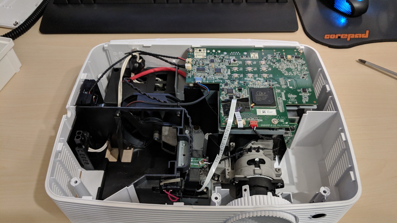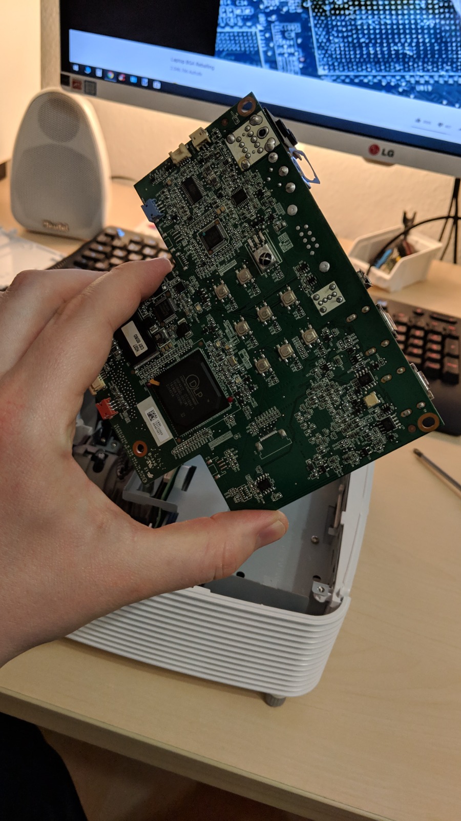 Hab ich quasi später gefixt indem das mittlere Brett mit Winkel weiter nach hinten versetzt. Ebenfalls restliches Filz drauf geklebt damit das Brett auch schwarz ist und für den Fall der Fälle die Folie eine weiche Auflage hat. Man sollte einfach für eine recht schmale Auflage sorgen (falls die Leinwand nicht eingerollt wird) sondern schwenkbar ist. Am besten ist natürlich einfach eine Rahmenleinwand die dort immer hängen kann Kommen wir zum Beamer ... achja. Mein bisher erster Beamer. Full HD Beamer von Optoma - Model HD27. Bisher immer noch in Nutzung Jetzt aber mit einer 120" Leinwand die man einfahren kann - eSmart Tension .. also nix besonderes. Den Beamer abgestaubt (Jahr später) und auch mal ordentlich gepustet ... und siehe da - STAUB im Bild ! Niemals bitte reinpusten !! Nur abstauben. OMG! Schock war entsprechend groß (dadurch vergessen Bild von zu machen - komplettes Bild hell gesprenkelt) Also YOLO - Beamer auf und säubern Platine ausgebaut - KLAR ! muss man alles ausbauen um an den Sensor + Linse zu kommen. GAME - ( Ryzen 7 / RX 9070 / 32GB / B650 )