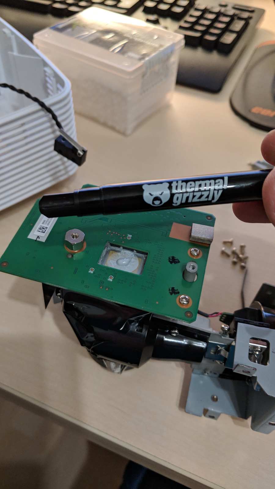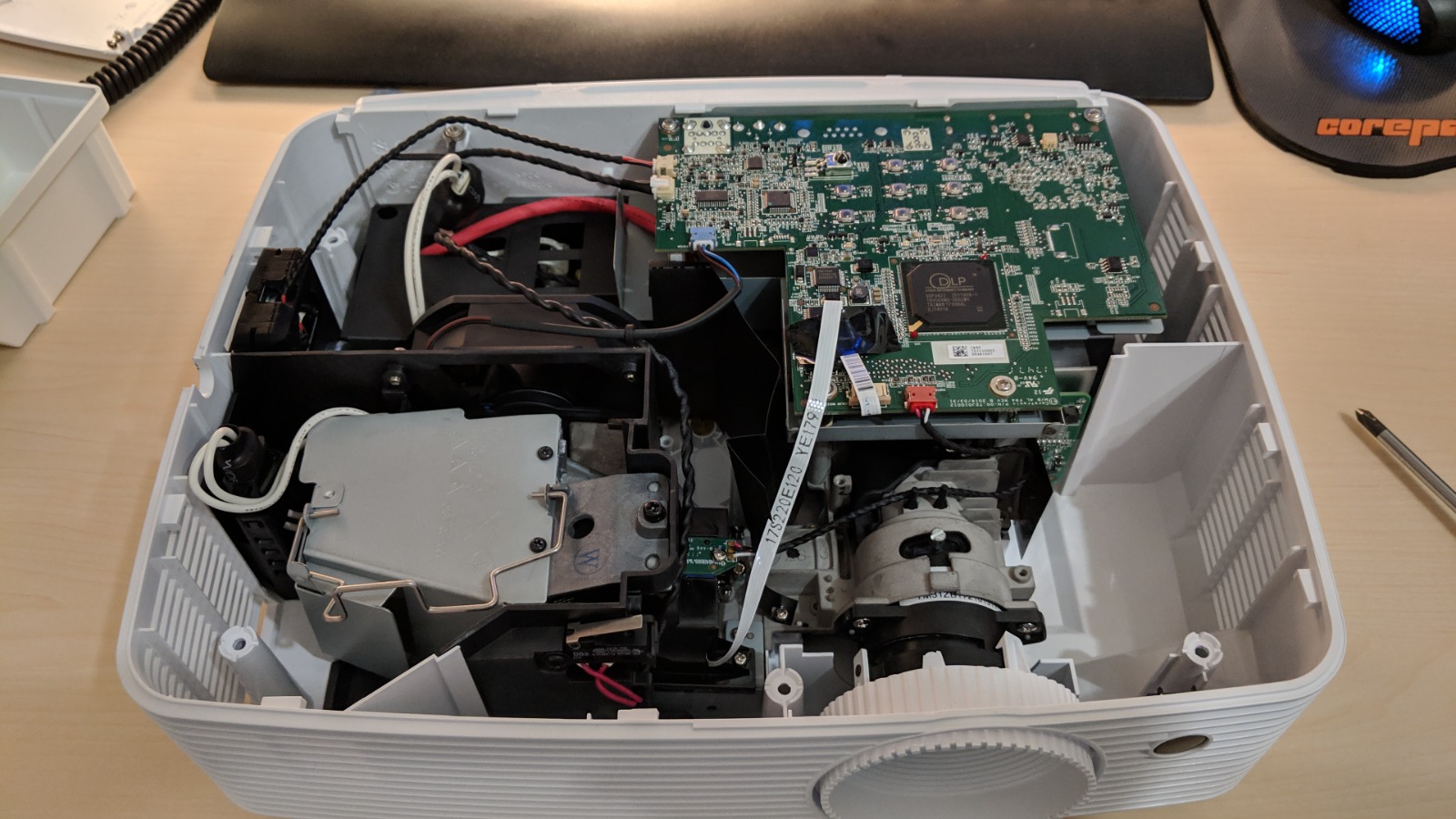 Sorry für die vielen Beiträge. Kann wohl nur 5 Links pro Beitrag hinzufügen: Also von links kommt das Licht und wird auf den DLP Sensor geleitet. Links in der linken Umhausung müsste das Farbrädchen drin stecken. Das eben schon für das richtig eingefärbte Licht sorgt. Verkabelung ist das wohl Stromversorgung sowie Synchronisation zwischen Farbrad und Sensor. Hinter der größeren grünen Platine sitzt ein Kühlkörper. Der gesockelte DLP Sensor wird von hinten gekühlt. Korrigiert mich, wenn ich falsch liege Ein Blick durch die Linse. Sowie diese geschwungene Lichtleitführung. Echt interessant. Zu diesem Zeitpunkt wusste ich natürlich nicht ob ich das jemals wieder zusammen bekomme und alles tut wie es soll. Der gesockelte Sensor. Alles sorgfältig gereinigt. Die Rückseite hat frische Wärmeleitpaste bekommen. Alles wieder zusammengebaut inkl. Birne. Was soll ich sagen - voller Erfolg ! Alles wie vorher. Da war ich schon etwas stolz auf mich Eben Frau nach dem Zeitraum gefragt um die Bilder zu finden. "Der Beamer war kaputt, was ?!?!" ... Oooops xD GAME - ( Ryzen 7 / RX 9070 / 32GB / B650 ) HTPC - ( Ryzen 5 / RTX 2080 Super / 16GB / B450 ) HIFI - DT 990 Pro, Nubert nuPro-200, Teufel Theater 500, Denon X2500H | |