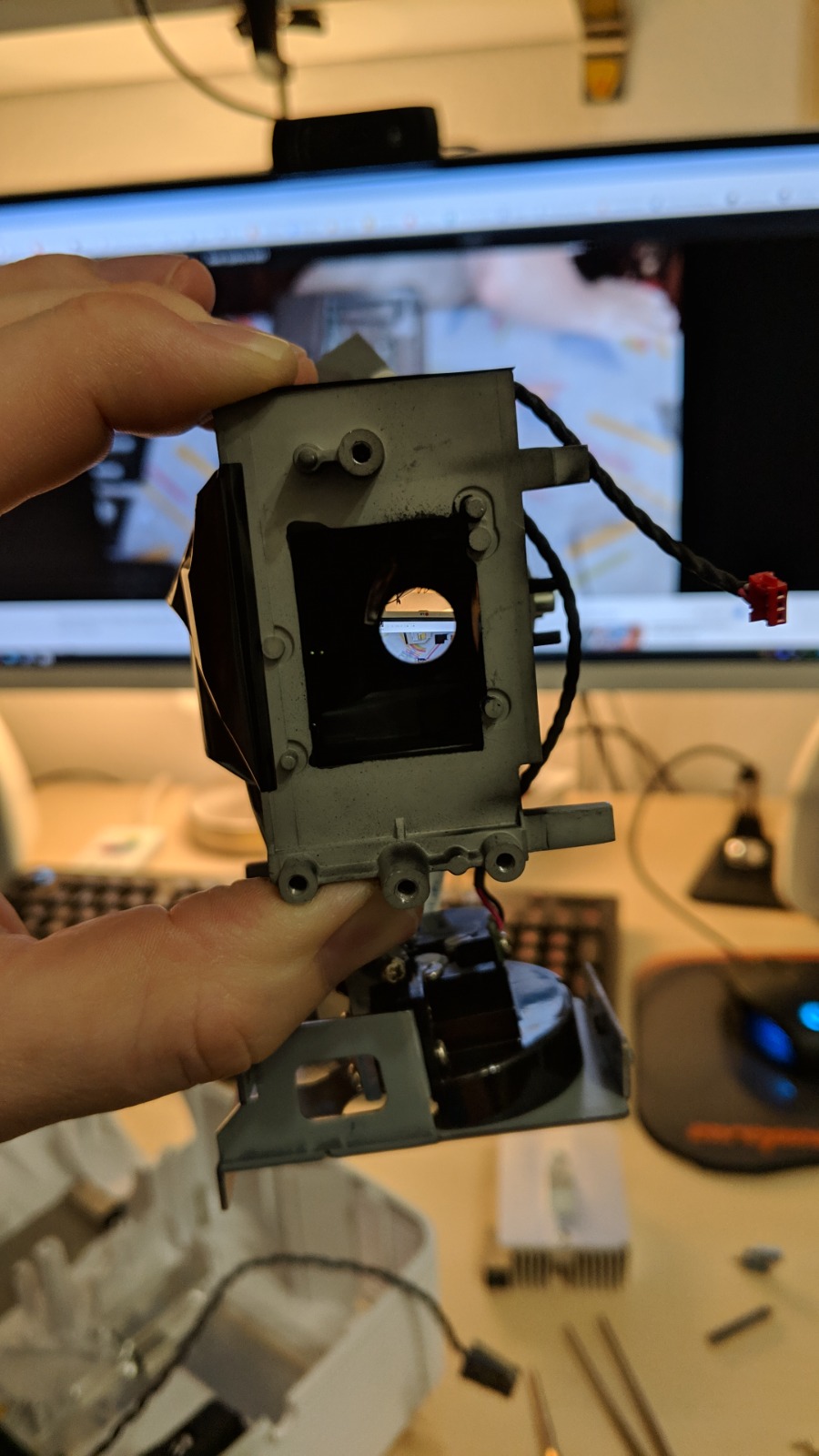Hab ich quasi später gefixt indem das mittlere Brett mit Winkel weiter nach hinten versetzt. Ebenfalls restliches Filz drauf geklebt damit das Brett auch schwarz ist und für den Fall der Fälle die Folie eine weiche Auflage hat. Man sollte einfach für eine recht schmale Auflage sorgen (falls die Leinwand nicht eingerollt wird) sondern schwenkbar ist. Am besten ist natürlich einfach eine Rahmenleinwand die dort immer hängen kann Kommen wir zum Beamer ... achja. Mein bisher erster Beamer. Full HD Beamer von Optoma - Model HD27. Bisher immer noch in Nutzung Jetzt aber mit einer 120" Leinwand die man einfahren kann - eSmart Tension .. also nix besonderes. Den Beamer abgestaubt (Jahr später) und auch mal ordentlich gepustet ... und siehe da - STAUB im Bild ! Niemals bitte reinpusten !! Nur abstauben. OMG! Schock war entsprechend groß (dadurch vergessen Bild von zu machen - komplettes Bild hell gesprenkelt) Also YOLO - Beamer auf und säubern Platine ausgebaut - KLAR ! muss man alles ausbauen um an den Sensor + Linse zu kommen. GAME - ( Ryzen 7 / RX 9070 / 32GB / B650 ) HTPC - ( Ryzen 5 / RTX 2080 Super / 16GB / B450 ) HIFI - DT 990 Pro, Nubert nuPro-200, Teufel Theater 500, Denon X2500H | |
