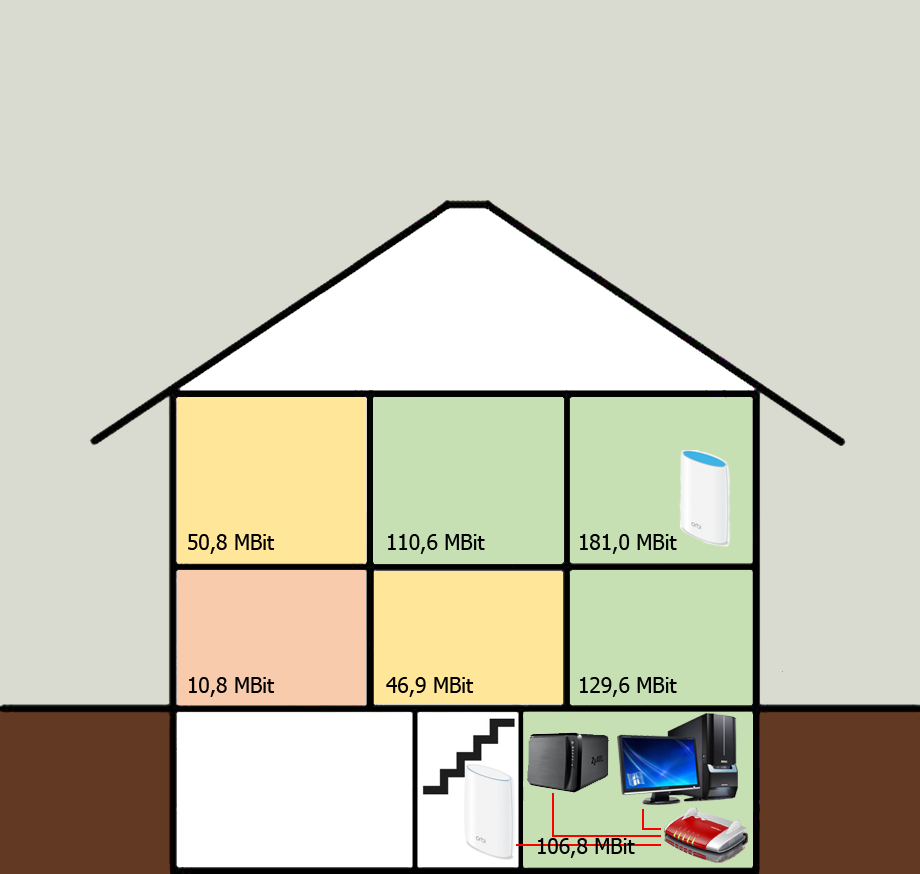 Zur Bestimmung der optimalen Position des Routers und des Satelliten, habe ich mir 3 Szenarien überlegt, welche ich miteinander vergleichen werde. Die größte Hürde ist dabei, das WLAN-Signal vom Keller möglichst verlustfrei bis in das 1. OG zu bekommen, da dort die meisten Clients bedient werden wollen. Hierbei wurde darauf geachtet, dass die Verbindung zwischen Router und Satellit bei keiner Konstellation so schwach wurde, dass der Satellit dies durch einen Wechsel der Farbe der Signalstärken-LEDs zum Ausdruck brachte. Diese waren zu jeder Zeit blau. Szenario 1 hat als Ziel, einen geringen Abstand zwischen Router und Satellit zu haben, um so zwischen diesen einen hohen Datendurchsatz zu gewährleisten. Der Satellit steht bei dieser Variante im Erdgeschoss. Der Nachteil, dass im Obergeschoss so vermutlich nur noch ein recht schwaches Signal zur Verfügung steht scheint hier jedoch vorprogrammiert zu sein. Für Szenario 2 soll der Satellit nun in das Obergeschoss umziehen, um die in diesem Bereich eingerichteten Clients möglichst gut versorgen zu können. Da dies mit dem Router im Hobby-Keller nicht machbar ist (Signalstärke schwankte zwischen Orange und Magenta), muss dieser in das Treppenhaus verlegt werden. Hier ist die Hoffnung, dass alle Räume ein gleich starkes Signal haben um in jedem ein Streaming in Full-HD zu ermöglichen. Szenario 3 ist eine Abwandlung von Szenario 2. Hier geht es lediglich darum, den im Satelliten eingebauten Gigabit-Switch im Wohnzimmer nutzbar zu machen, um an diesem nicht-WLAN-fähige Geräte anzuschließen. So entsteht leider die Gefahr, dass in einigen Räume kein ausreichend starkes Signal mehr zur Verfügung steht.