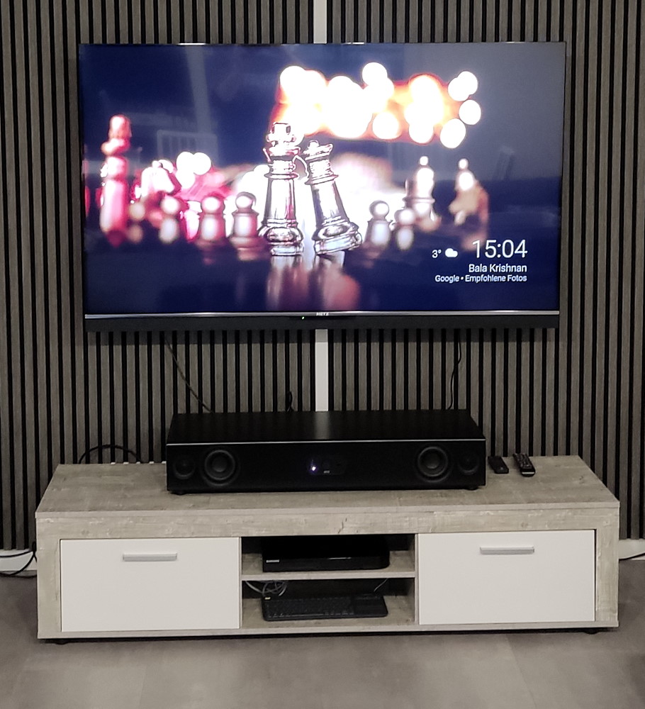 ich möchte den Thread hier nutzen und mein Feedback zu der Soundbar teilen. Zuerst aber nochmals ein herzliches Dankeschön! das ich der Glückliche bin der solch eine Soundbar sein Eigen nennen darf. Die Nubert AS-3500 hat sich schon gut eingelebt (auch wenn die Verkabelung noch nicht gemacht ist) und wurde auch sofort angenommen in der Familie. Hier mal ganz simpel eine Blu Ray zum Größenvergleich: Räumlich ist der Soundbar direkt anzusehen das sie wohl hauptsächlich in Wohnzimmer / größere Räume einziehen wird. Das ist natürlich jedem selbst überlassen Den TV Sound ersetzt die Soundbar seit Tag 1. Bisher hatte ich nur für eine kleinen Hörtest Zeit. Wir haben uns auch sehr schnell an die Voice+ Funktion gewöhnt. Auch dort kann der Klang und Tiefgang überzeugen und hilft dem Bild einfach um Längen! Auch die nach vorne gerichteten Lautsprecher des METZ BLUE TVs, haben hier in keinster Weise eine Chance. Wenig überraschend bei diesem Gegner Die Soundbar ist über HDMI direkt mit dem TV verbunden und schaltet sich somit auch automatisch AN/AUS. Auch die Lautstärke wird dann mit der TV Fernbedienung geregelt. Leider bekommt man keine Zahl angezeigt an der man sich orientieren kann. Platzhalter "TV Lautstärke" Darstellung Zur Lautstärke: Voll aufdrehen konnte ich die Soundbar bisher nicht. Wirklich heftig! Auch fehlt es nicht an Dynamik wenn in erhöhter Lautstärke gespielt wird. Das habe ich bei aktiven Lautsprechern auch schon anders erlebt. Ist Loudness aktiviert, ist es abends kaum möglich "leise" zu hören. Rücksicht auf einschlafende Kinder geht somit nur mit deaktivierter Loundess. Dann kann man sehr fein dosieren, anders ist zwischen MUTE und der ersten Stufe der Lautstärke doch schon ein gewisser Pegel vorhanden. Dafür sind aber eben auch die verschiedenen Profile auswählbar. Da bin ich ehrlich gesagt noch etwas in der Findungsphase. Wenn alles etwas zur Ruhe kommt, möchte ich mir die Zeit nehmen und verschiedene Settings für Musik und TV testen und einprogrammieren (einfach die "P" - Taste gedrückt halten bis alle LEDs um das Steuerrad weiß aufleuchten - gespeichert. Sind die verschiedenen Farben und Anordnungen der LEDs rund um das zentrale Steuerrad erst einmal verinnerlicht (bebilderte Anleitung anbei), ist es in Zukunft recht schnell und einfach zu konfigurieren. Anfangs dachte ich erst, es wäre besser die Profile je nach Source zu konfigurieren. Nubert sollte recht behalten. Schon ist der Usecase da ! Die unterste Reihe der Fernbedienung lässt somit 3 verschiedene Konfigurationen zu. In meinem Fall wären das folgende: P1 - TV tagsüber (loudness ON; Voice+) P2 - TV abends (loundess OFF; Voice+) P3 - Center Speaker Was hab ich denn bitte getrieben seit dem die Soundbar da ist ? ... nun, die vorweihnachtliche Zeit ist leider nie wirklich ruhig. Daher hatte ich bisher nicht die Zeit, die eben die Soundbar verdient. Mein Ziel ist es, diese eben auch als Center Lautsprecher nutzen zu können. Da ich mit dem PreOut am Denon AVR-X2500H nicht wirklich weitergekommen bin (für jede Hinweis/Idee dankbar) Hatte ich den folgenden Anlauf gestartet: Ein Level Converter + Y-Chinch Kabel: Normal nutzt Teufel diesen um zB eine REAR Station anzuschließen. High Output in Low Output verwandeln, das Signal dann abgreifen und via Funk/WLAN an die REAR zu schicken (hab da keine Erfahrungswerte) Gut, hier bräuchte ich also nur einen Kanal, gesagt, getan: Soweit vorbereitet dann angeschlossen: Vorweg: Es funktioniert ! Aber klanglich wohl nicht so einfach wie ich mir das vorgestellt habe. Wenn hier jemand schon einen ähnlichen Spagat gemacht haben sollte, lasst es mich wissen Ich werde mir noch einige Lieder raussuchen und diese anhören wenn ich mit der Einstellung zufrieden bin. Durch die Sanierung ist noch einiges zu tun (hängt kein einziges Bild an der Wand womit der Raumklang ebenfalls noch ein anderer ist) Ich wollte trotzdem schon einmal hiermit auch meinen Dank ausdrücken. Die Soundbar ist "mächtig" und evtl. nicht für jeden Haushalt machbar. Auch kann die größere schwarze Fläche "einladen" für irgend eine Deko Wenn der TV natürlich direkt drauf steht, hat sich das Thema erledigt. Soweit erst mal von mir Liebe Grüße und eine schöne Weihnachtszeit ! Achja - wenn ich das richtig sehe, habe ich da die Büchse der Pandora geöffnet. Man kann sich wohl Pre-Outs ziehen indem man den Receiver umlötet ... ich muss mich wohl einlesen, dann könnte ich wohl direkt anschließen. Mal schauen ... stay tuned ! GAME - ( Ryzen 7 / RX 9070 / 32GB / B650 )