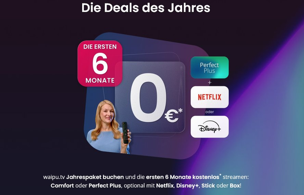 Die Aktion gilt zudem für Varianten mit Stick oder Box sowie für Kombinationen mit Disney Plus oder Netflix. Auch das Comfort Jahrespaket wird im Rahmen des Angebots ein halbes Jahr lang ohne Kosten bereitgestellt. Inhalte können auf Fernseher, Tablets, Smartphones oder Laptops gestreamt werden. Mehrere parallele Streams erlauben eine gleichzeitige Nutzung innerhalb der Familie.