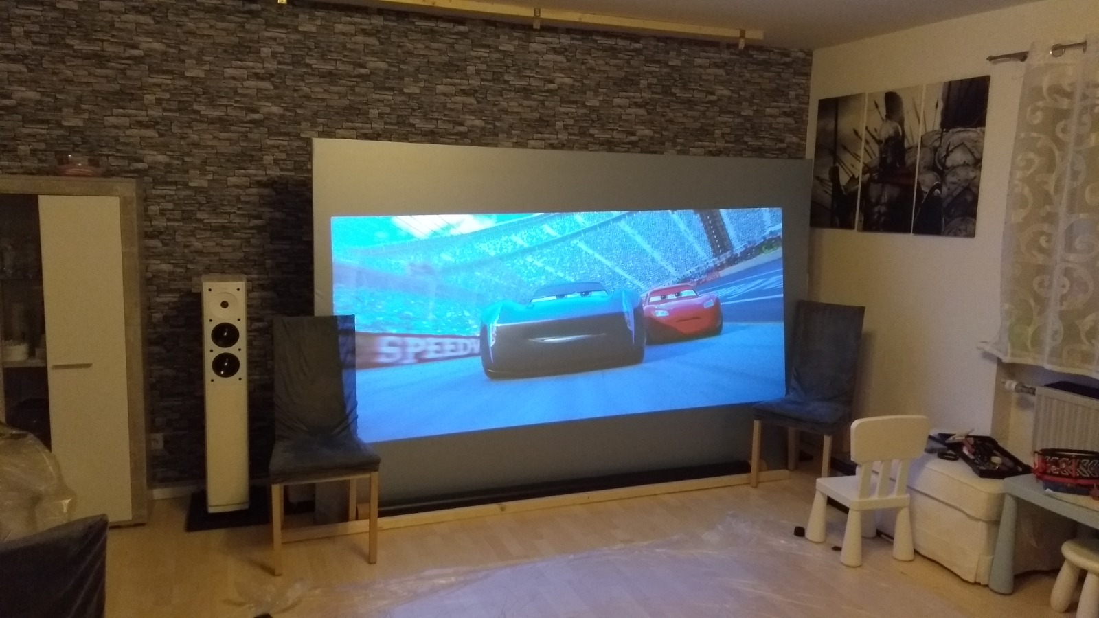Dann zur Frau gezogen, Papa geworden und 2018 einen Beamer gekauft (auf den gehe ich gleich nochmal extra ein) Das Geld von der Chefin freigegeben, hatte ich mir gesagt: "mach schnell, nicht dass man in der Familie auf eine andere Idee kommt" Planung: selbst faltbare 120" Leinwand mit der beste Folie die man bekommt. Der mittlere Steg, stellte sich später aus Fehler heraus (gleich mehr dazu) Damals im HiFi-Forum "kurz" geschaut und direkt bestell (musste schauen ob ich die Bezeichnung noch finde) Jamos sind damals mit umgezogen + Canton Sub ebenfalls in weiß Alumembran sagte mir damals mehr zu als die Pappe von XTZ. Filz aufgeklebt für eine Maskierung und bessere Kontrast: Test und Verschraubung der Leinwand am Kippmechanismus. GAME - ( Ryzen 7 / RX 9070 / 32GB / B650 ) HTPC - ( Ryzen 5 / RTX 2080 Super / 16GB / B450 ) HIFI - DT 990 Pro, Nubert nuPro-200, Teufel Theater 500, Denon X2500H | |
