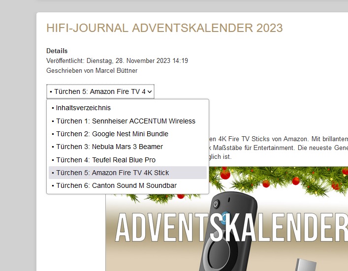 Irgendwie geht der Adventskalender für heute immer noch nicht, ich werde immer wieder auf den 5. Dezember umgeleitet. Gibt es nun den Firestick oder die Soundbar zu gewinnen? | |