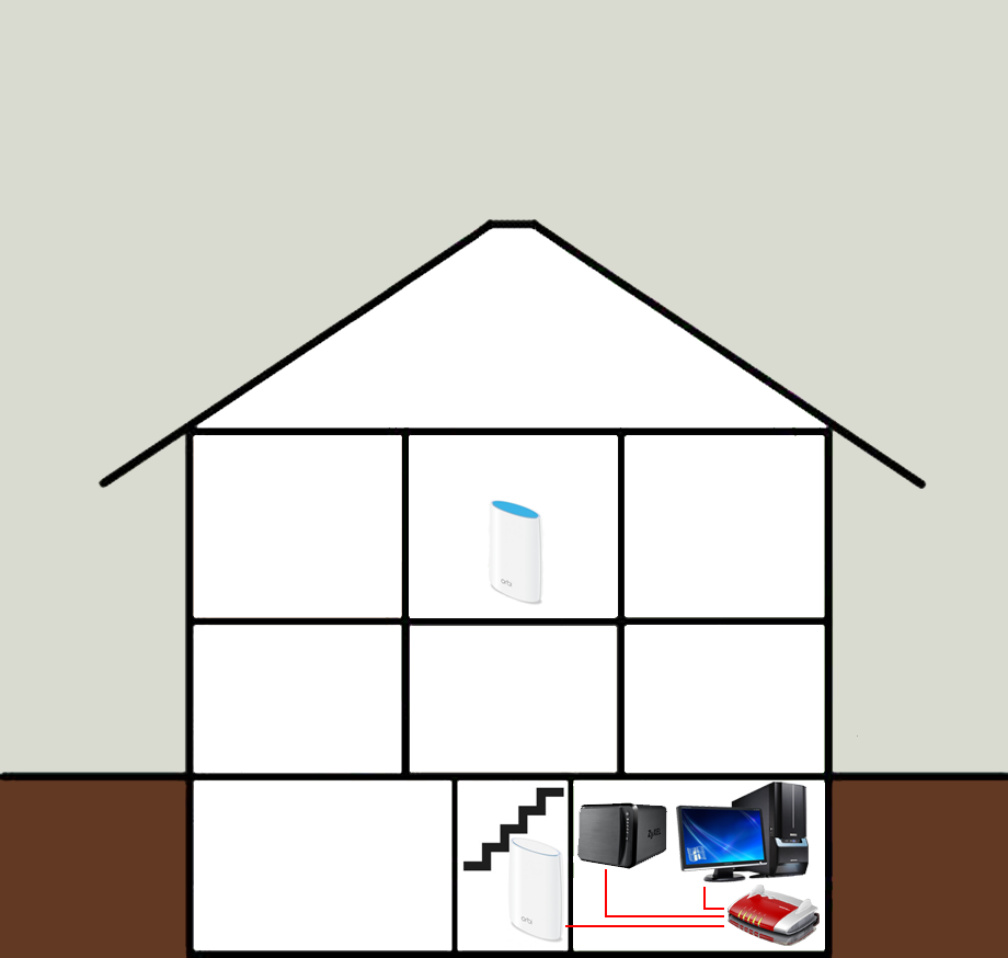 Zur Bestimmung der optimalen Position des Routers und des Satelliten, habe ich mir 3 Szenarien überlegt, welche ich miteinander vergleichen werde. Die größte Hürde ist dabei, das WLAN-Signal vom Keller möglichst verlustfrei bis in das 1. OG zu bekommen, da dort die meisten Clients bedient werden wollen. Hierbei wurde darauf geachtet, dass die Verbindung zwischen Router und Satellit bei keiner Konstellation so schwach wurde, dass der Satellit dies durch einen Wechsel der Farbe der Signalstärken-LEDs zum Ausdruck brachte. Diese waren zu jeder Zeit blau. Szenario 1 hat als Ziel, einen geringen Abstand zwischen Router und Satellit zu haben, um so zwischen diesen einen hohen Datendurchsatz zu gewährleisten. Der Satellit steht bei dieser Variante im Erdgeschoss. Der Nachteil, dass im Obergeschoss so vermutlich nur noch ein recht schwaches Signal zur Verfügung steht scheint hier jedoch vorprogrammiert zu sein. Für Szenario 2 soll der Satellit nun in das Obergeschoss umziehen, um die in diesem Bereich eingerichteten Clients möglichst gut versorgen zu können. Da dies mit dem Router im Hobby-Keller nicht machbar ist (Signalstärke schwankte zwischen Orange und Magenta), muss dieser in das Treppenhaus verlegt werden. Hier ist die Hoffnung, dass alle Räume ein gleich starkes Signal haben um in jedem ein Streaming in Full-HD zu ermöglichen. Szenario 3 ist eine Abwandlung von Szenario 2. Hier geht es lediglich darum, den im Satelliten eingebauten Gigabit-Switch im Wohnzimmer nutzbar zu machen, um an diesem nicht-WLAN-fähige Geräte anzuschließen. So entsteht leider die Gefahr, dass in einigen Räume kein ausreichend starkes Signal mehr zur Verfügung steht.