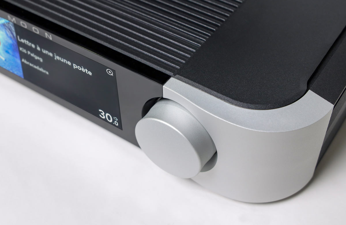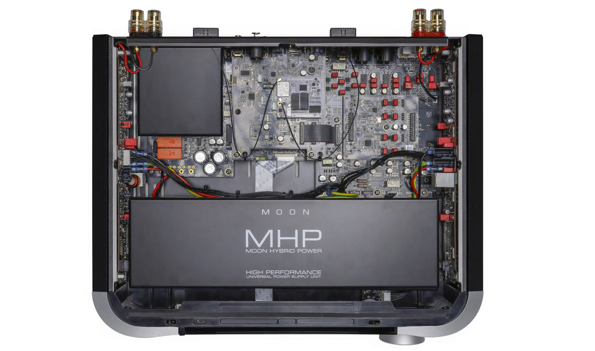 Im Inneren des Verstärkers arbeitet das MOON Hybrid Power Supply (MHP), das für eine besonders stabile Stromversorgung sorgt. Ergänzt wird es durch die MDCA-Topologie (MOON Distortion Cancelling Amplifier), die harmonische Verzerrungen minimiert und so für maximale Linearität und Transparenz sorgt. Die Endstufe liefert 2 x 100 Watt an 8 Ohm bzw. 2 x 200 Watt an 4 Ohm, was ausreichend Leistungsreserven auch für anspruchsvolle Lautsprecher garantiert.