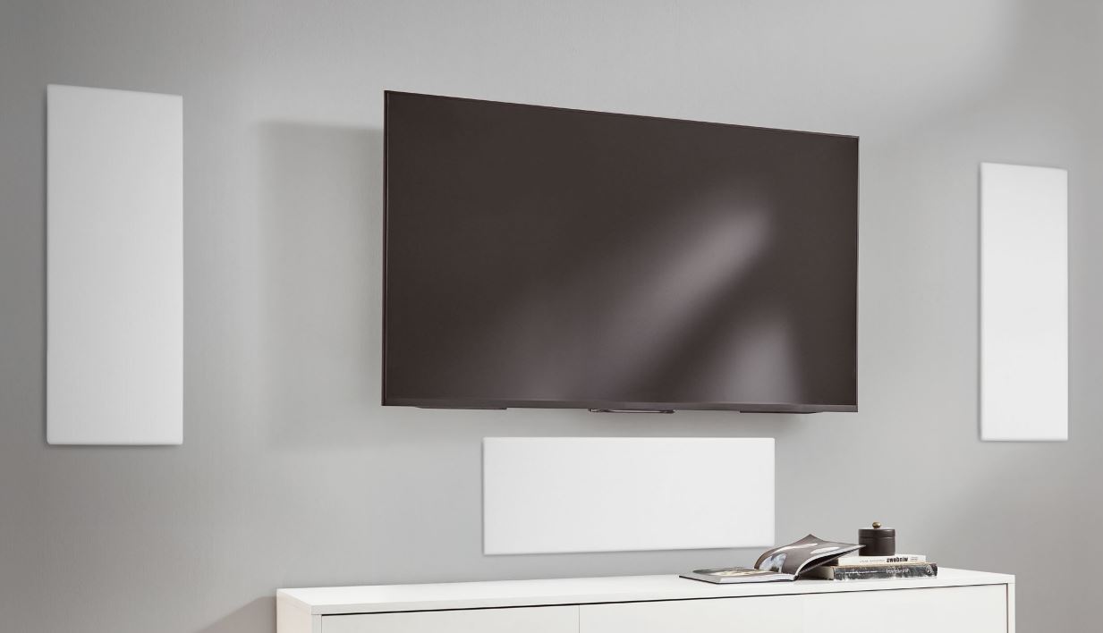 Die InWall-Variante ist auf eine besonders zurückhaltende Integration ausgelegt. Mithilfe des beiliegenden Montagesets werden die Lautsprecher direkt in die Wand eingelassen. Sichtbar bleibt lediglich die rahmenlose, magnetische Stoffbespannung, die größer ausfällt als bei der OnWall-Version und den Einbauausschnitt vollständig verdeckt. Damit ergibt sich ein homogenes Erscheinungsbild, das sich unauffällig in die Wohnumgebung einfügt. Auch die InWall-Modelle unterstützen die VESA-Norm und verfügen über die gleiche Treibertechnik wie die OnWall-Ausführung.