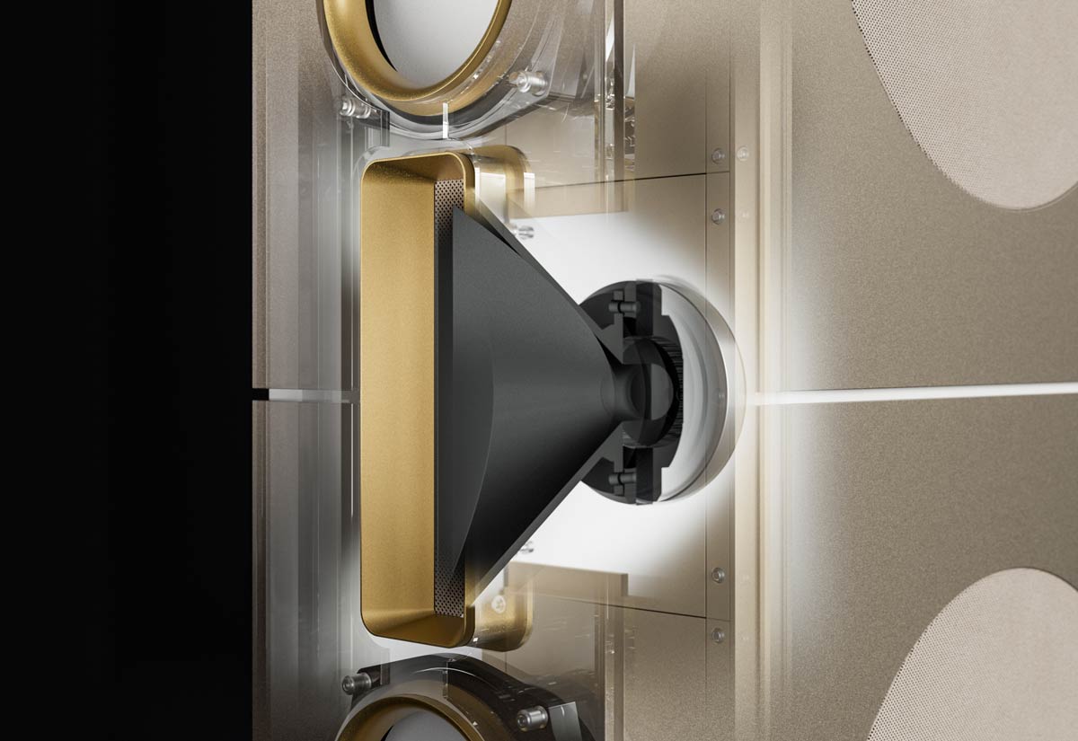 Im Inneren arbeiten vier seitlich verbaute 30-Zentimeter-Tieftöner in geschlossenen Gehäusen, ergänzt durch ein Array aus zehn Mitteltönern und den Fraunhofer-Zylinderwellenstrahler im Hochtonbereich. Die gesamte Signalverarbeitung übernimmt ein FIRTech-Prozessor, der für phasen- und zeitkorrigierte Wiedergabe sorgt. Pro Lautsprecher stehen dafür bis zu 3000 Watt Systemleistung zur Verfügung.