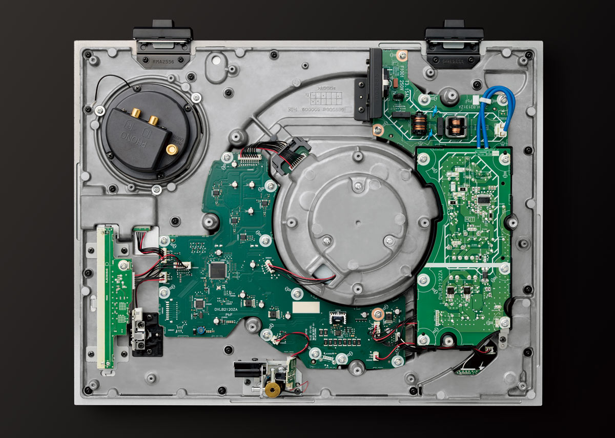 Unterstützt wird das mechanische Konzept durch ein mehrstufiges Schaltnetzteil, das ähnlich wie beim Referenzmodell SL-1000R arbeitet. Es kombiniert ein Hochfrequenznetzteil mit einer speziellen Rauschunterdrückungsschaltung, die Störungen durch gegenphasige Einspeisung minimiert. Das Ergebnis ist ein äußerst niedriges Grundrauschen und ein verbessertes Signal-Rausch-Verhältnis.