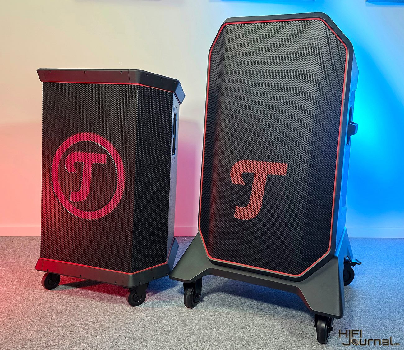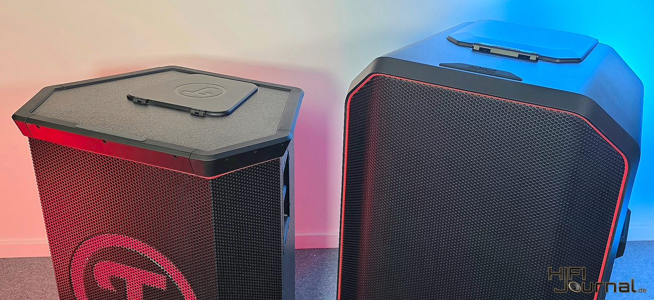 Optisch orientiert sich das neue Modell stärker an aktuellen Teufel-Produkten wie dem ROCKSTER AIR 2. Linienführung und Oberflächen wirken moderner, ohne den typischen PA-Charakter aufzugeben. Das Gehäuse besteht weiterhin aus MDF-Holz, was in dieser Leistungsklasse Vorteile hinsichtlich Stabilität und Resonanzkontrolle bietet.