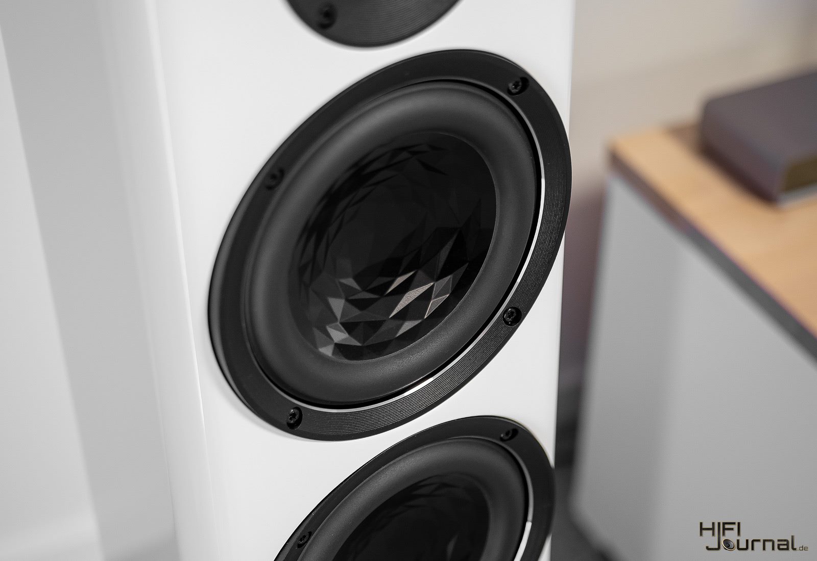 Bei den Mittel- bzw. Tiefmitteltönern setzt man auf „alte“ Bekannte, den AS-XR Chassis. Jene kennen wir schon aus deutlich älteren Modellreihen, diese haben sich aber mittlerweile zum Markenzeichen der Kieler Schmiede entwickelt. Dabei kommt die bekannte Kristallmembran-Technologie zum Einsatz. Diese Oberfläche soll nicht nur gut aussehen, sondern bietet auch einen technischen Nutzen. Die Aluminiumkalotte wird mit dem Pappkonus verbunden und die Kristallprägung erhöht die Steifigkeit der Aluminiumkalotte. Das soll helfen, die Resonanzen und Klangverfärbungen zu reduzieren und gleichzeitig die Belastbarkeit als auch Dynamik zu verbessern.