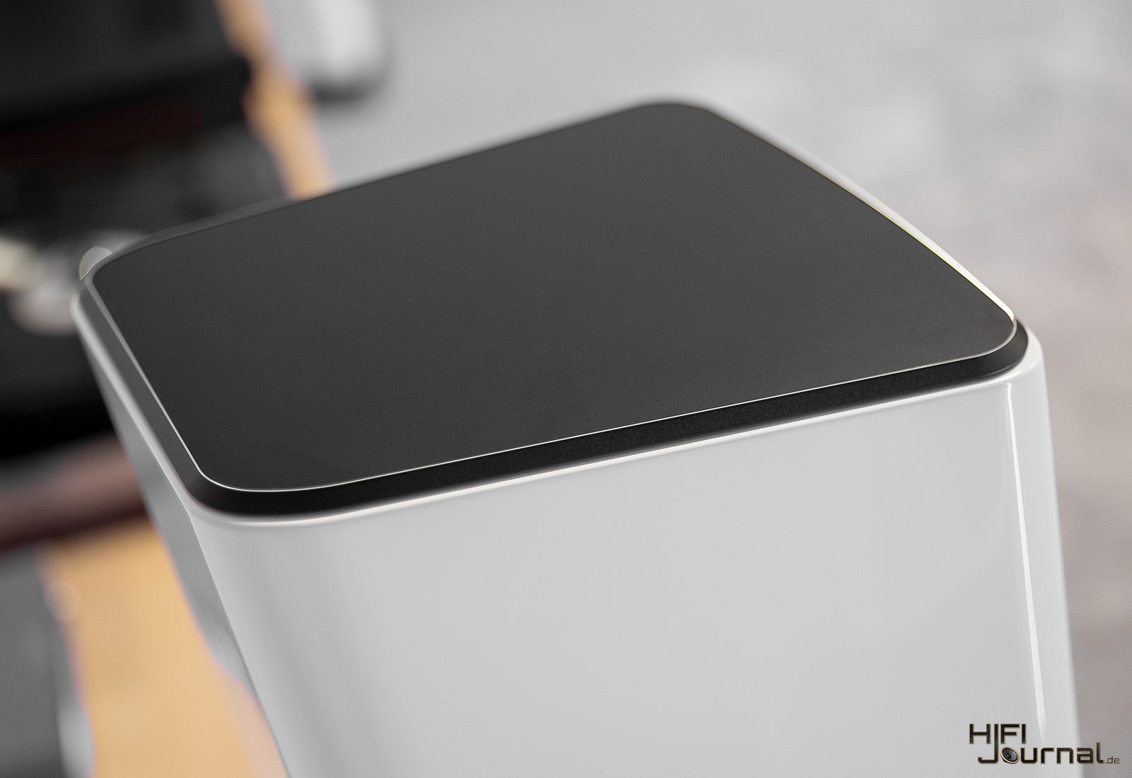Die aufgetragene Lackierung am Gehäuse bringt eine erstklassige Tiefe mit, die den bekannten „Wellenschlag“ in keiner Weise erkennen lässt. Oben und an den Chassis wurden exzellent gefräste Aluminiumringe platziert, die speziell bei der weißen Farbausführung für den perfekten Kontrast sorgen. Zwar wurden alle Bauteile mit sichtbaren Verschraubungen am Gehäuse befestigt, aber der dadurch leicht technische Charakter steht der Vela Standbox sehr gut.