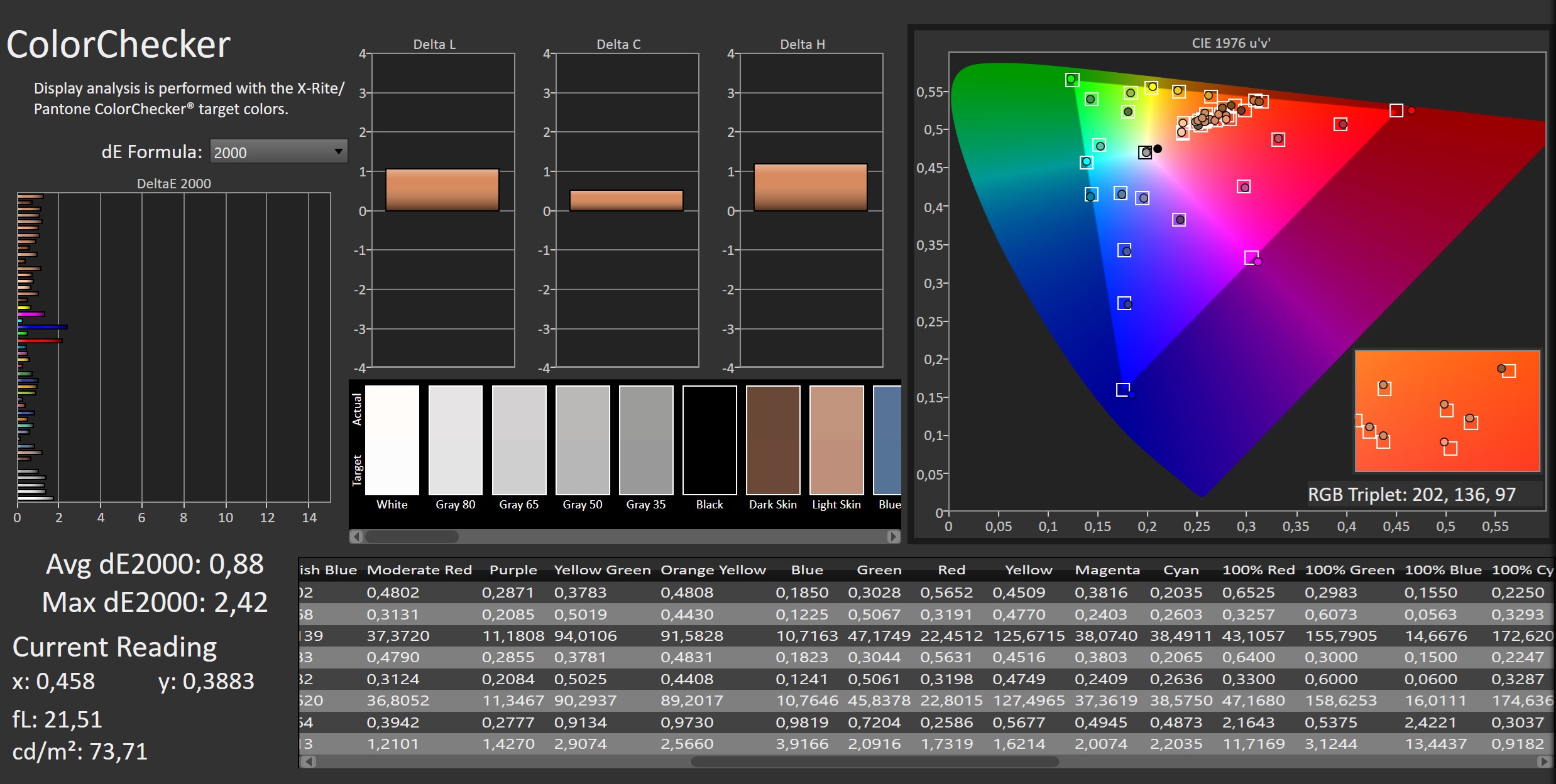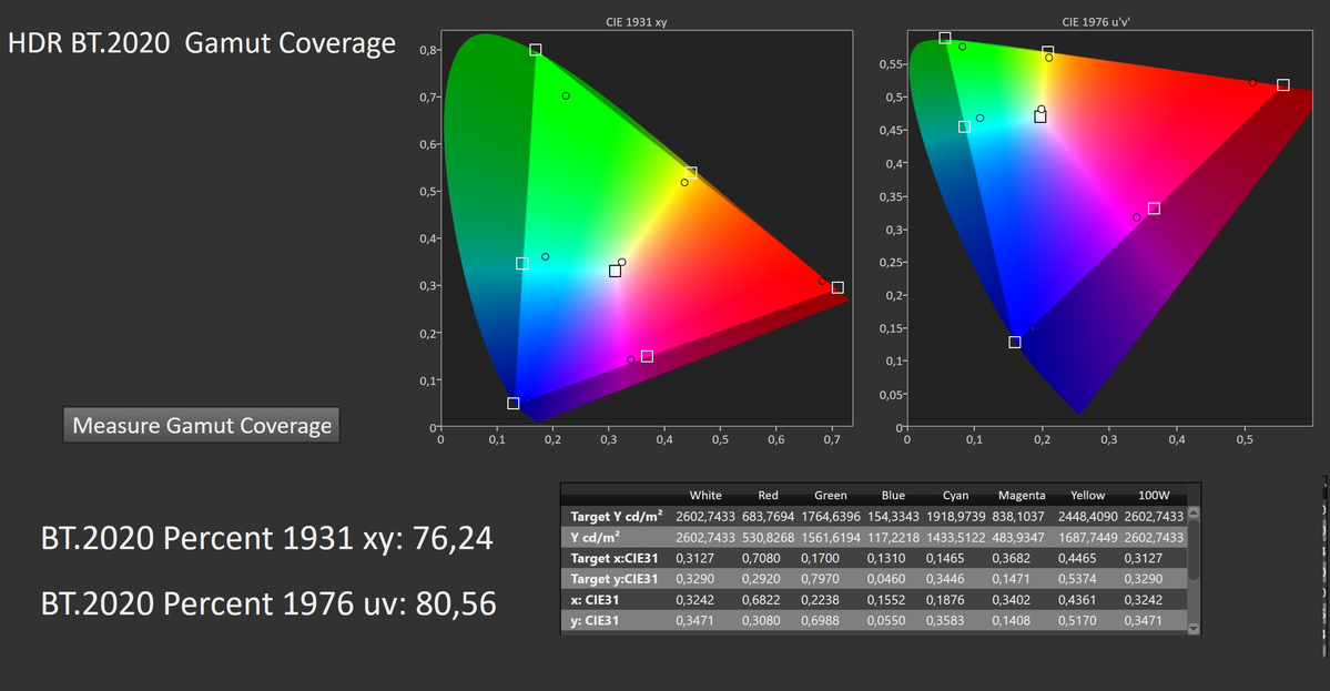 | Rec. 2020 Gammut | 81,2 % | 88,4 % | 80,6 % | 75,1 % | 74,2 % |