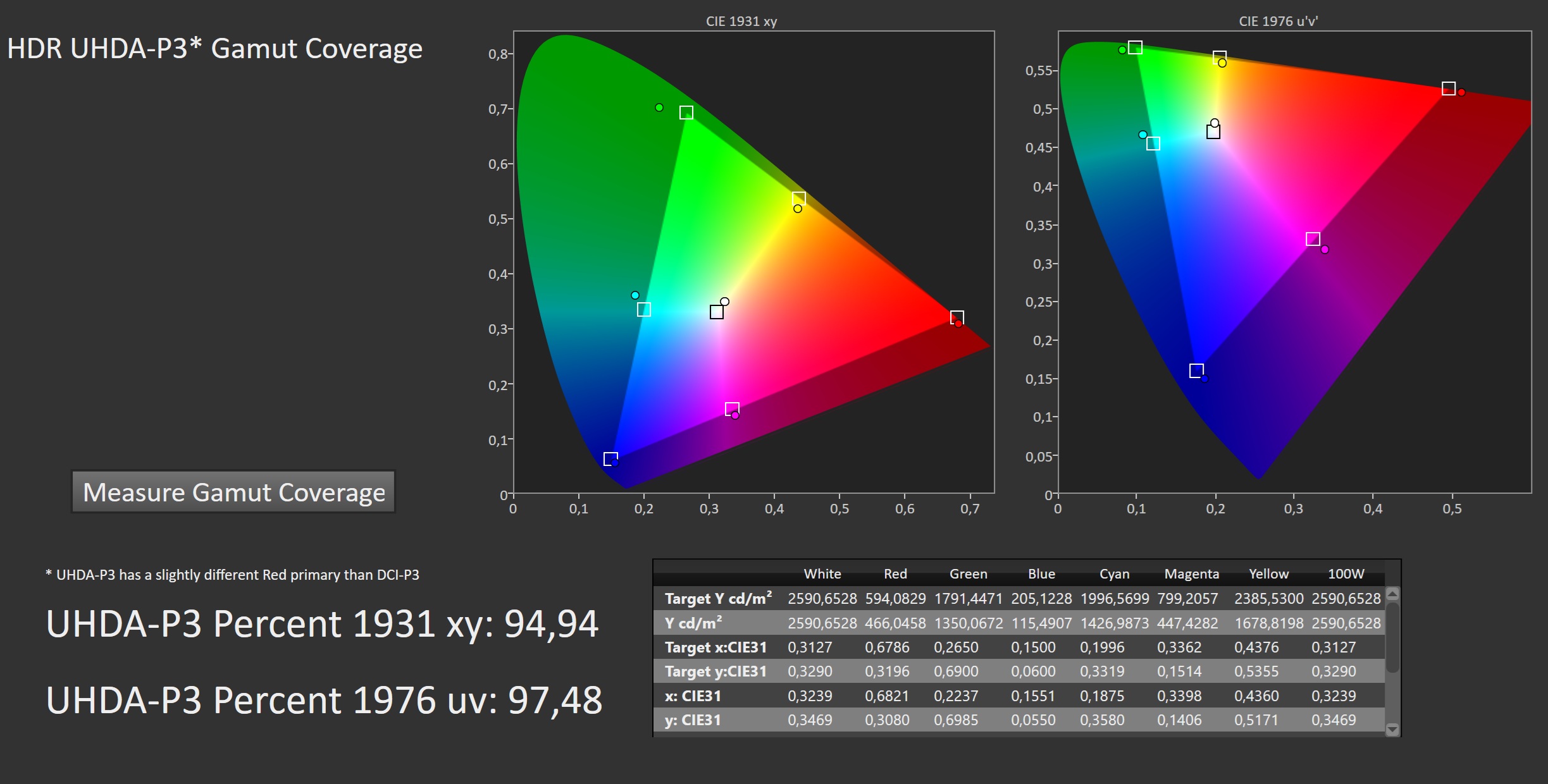 | UHDA-P3 Gammut | 99,5 % | 99,9 % | 97,5 % | 98,7 % | 98,6 % |
