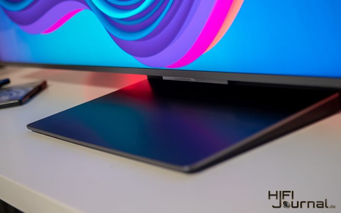 Für einen stabilen Stand sorgt eine aus zwei Teilen zusammengeschraubte Fußhaltung, die mit Aluminium-Applikationen eine wertige Optik erzeugen möchte. Man kann diese Während der Montage auch leicht in der Höhe verändern, sodass darunter eine Soundbar Platz nehmen kann und nicht in das Bild ragt. Wer dies nicht vorhat, schraubt die Füße einfach in der tieferen Position an.